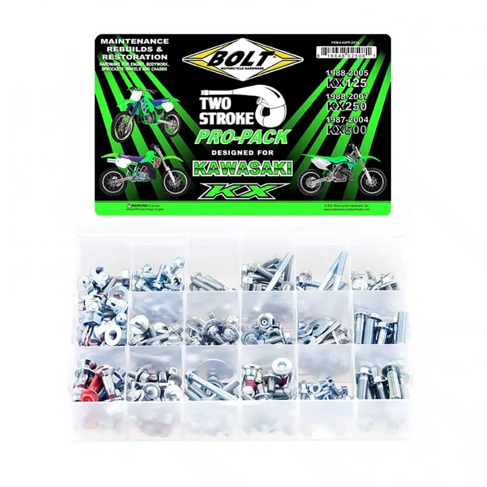 This Two-Stroke Pro-Pack is designed for maintenance, rebuilds, and restoration of KX125/250/500. Includes engine hardware, bodywork fasteners, a full set of sprocket bolts, chain adjusters, rotor bolts. OEM style fasteners for fork & axle clamps, chain sliders, lower subframe, radiators, rear brake, handlebar controls, triple clamps, pipe & silencer, and thread chasers. Organized container includes a placement guide.
